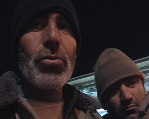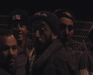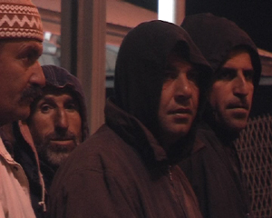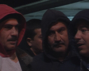 a van arrives. Some men descend quickly and begin to walk. Determined.